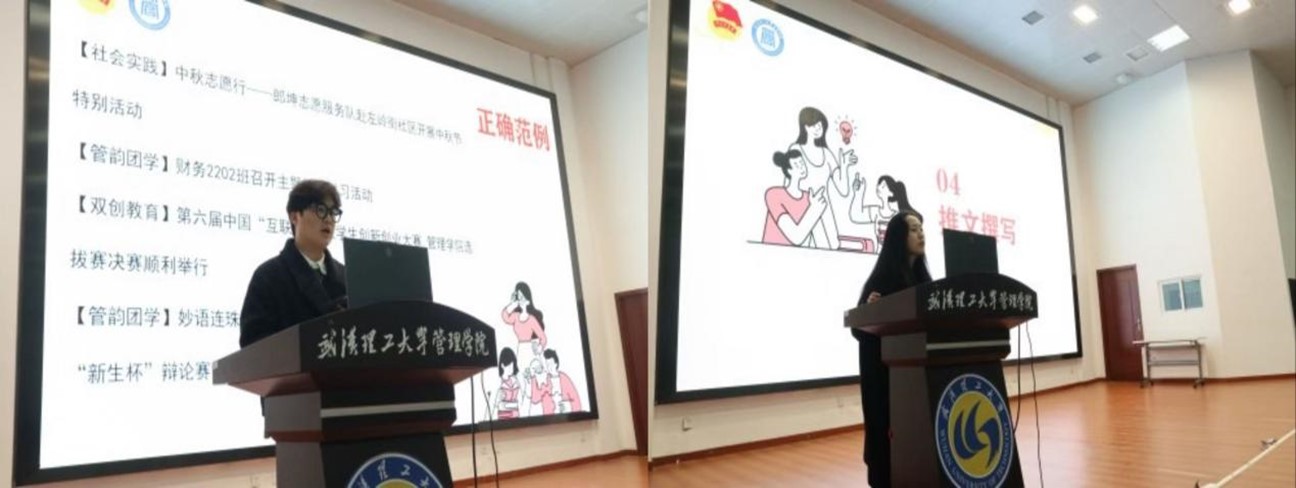 学院团委宣传部骨干向逸舟、蔡瑞雪同学以《宣传技巧与新闻写作规范》为题,面向全体学员详细讲解新闻采写、推文撰写的基本原则,引导更多学生干部加入到学院与学校宣传思想文化建设工作中来。