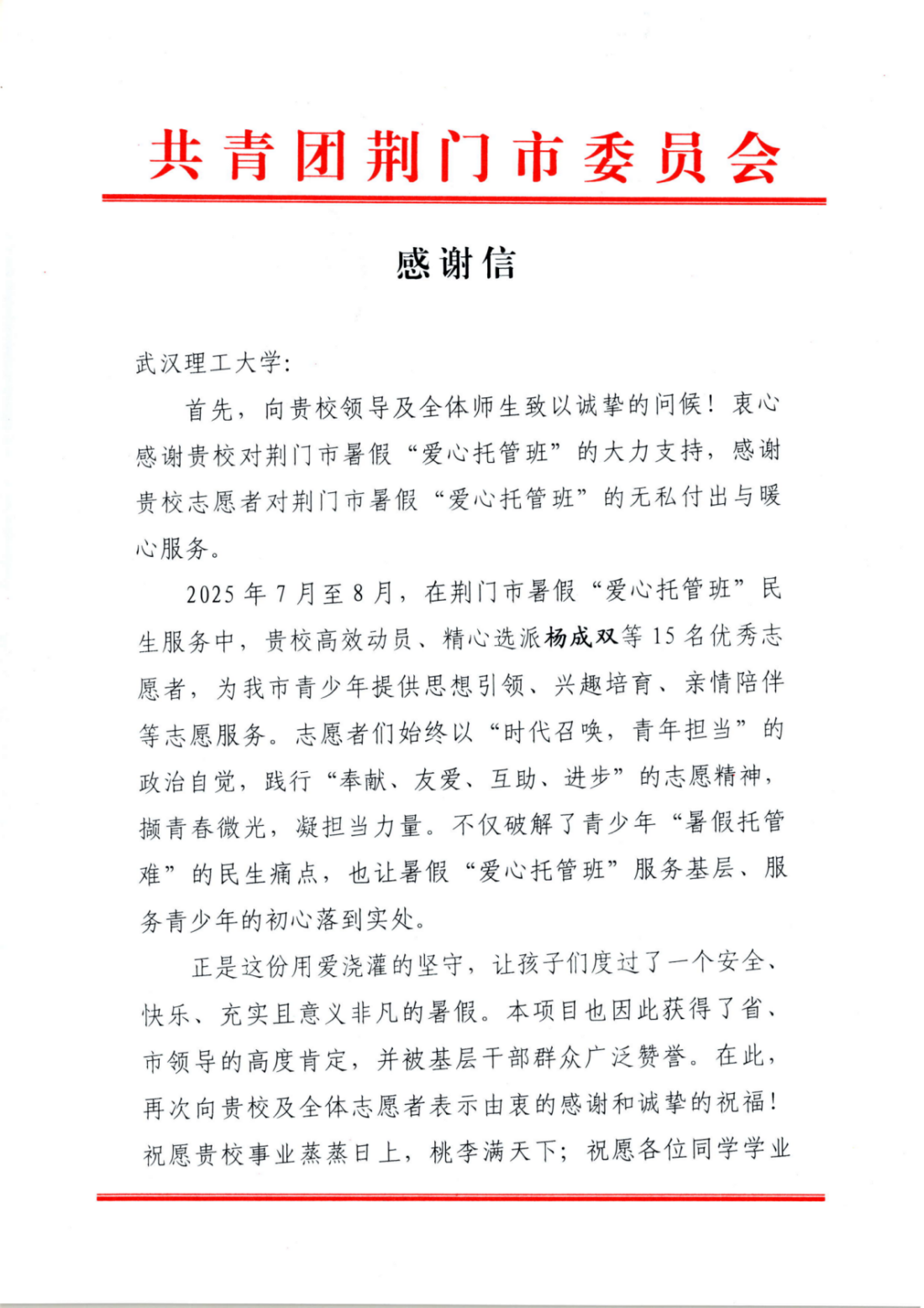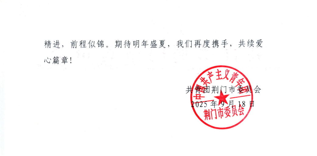 9月18日,娱乐城网址 郎坤志愿服务队组建的“红润童心 青春笃行”暑期社会实践队的队员们收到了来自共青团荆门市委的一封感谢信,信中肯定了队员们的奉献付出,并对其表达了高度赞扬。